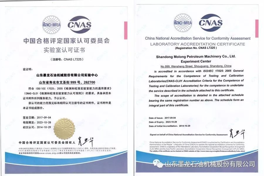 山東墨龍石油機(jī)械股份有限公司實驗中心近期順利通過CNAS(國家實驗室認(rèn)可)擴(kuò)項、換證現(xiàn)場評審,并于2017年9月4日取得新的證書。