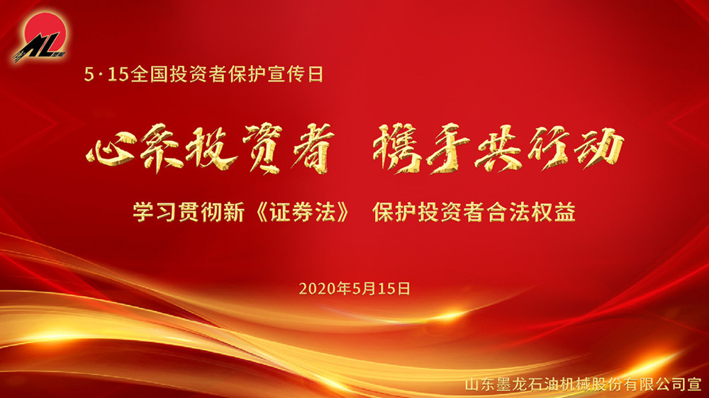 為做好“5.15全國(guó)投資者保護(hù)宣傳日”的投資者保護(hù)宣傳,山東墨龍(002490)積極響應(yīng)山東證監(jiān)局號(hào)召,以“心系投資者,攜手共行動(dòng)—學(xué)習(xí)貫徹新《證券法》,保護(hù)投資者合法權(quán)益”為活動(dòng)主題,開展投資者保護(hù)宣傳活動(dòng)。公司將持續(xù)加強(qiáng)公司信息披露質(zhì)量、增加公司透明度,積極開展投資者互動(dòng)溝通工作,營(yíng)造良好的投資者關(guān)系氛圍,增進(jìn)投資者對(duì)上市公司的了解,全方位引導(dǎo)投資者樹立正確投資理念,更好地維護(hù)投資者的合法權(quán)益。